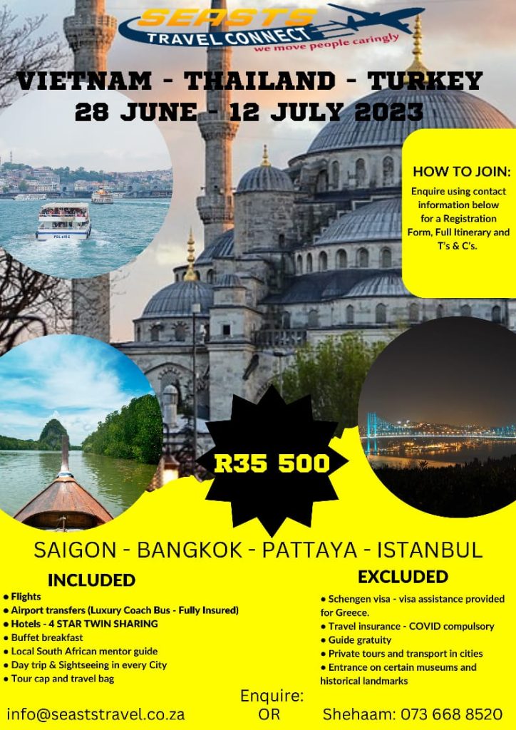 INDIVIDUAL & COUPLES PACKAGES MOZAMBIQUE ZANZIBAR Loading… GROUP PACKAGES 2023 SPAIN – MOROCCO GREECE – TURKEY SPAIN – PORTUGAL VIETNAM – THAILAND – TURKEY 2024 PHUKET – PHI PH ISLAND – JAMES BOND ISLAND SOLD OUT! BALI – SINGAPORE 5 PACKAGES AVAILABLE! GREECE – TURKEY TBA THE BALKANS 7 PACKAGES AVAILABLE! THAILAND – VIETNAM 5 PACKAGES AVAILABLE!